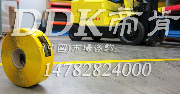 【工廠通道重載警示膠帶如何防止磨?】耐碾壓標識隔離膠帶什么牌子好?帝肯(DDK)耐叉車標識黃膠帶1250MM*20M/50MM*30M/100MM*30M(寬度可按客人要求任意定制)